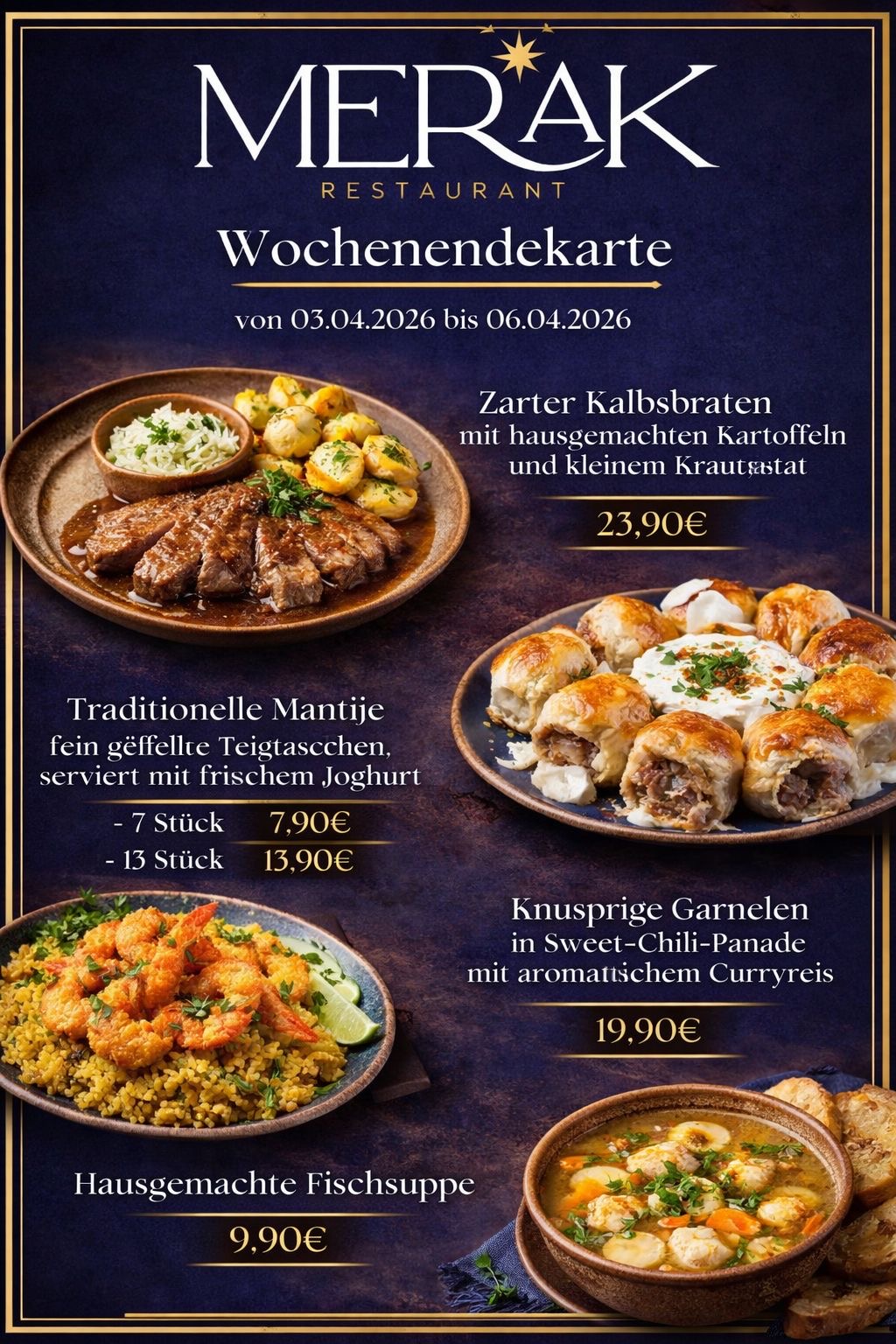 Die Speisekarte unseres Restaurants bietet eine vielfältige Auswahl an köstlichen Gerichten, die mit frischen, regionalen Zutaten zubereitet werden. Von traditionellen deutschen Spezialitäten bis hin zu internationalen Köstlichkeiten ist für jeden Geschmack etwas dabei. Lassen Sie sich von unseren saisonalen Angeboten und kreativen Menüs überraschen und genießen Sie ein unvergessliches kulinarisches Erlebnis in gemütlicher Atmosphäre.
